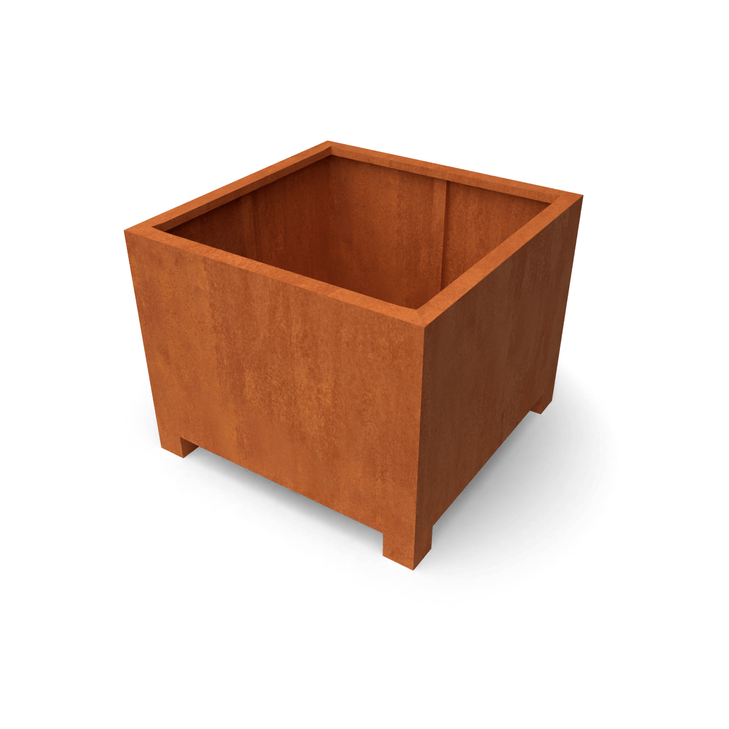 Pflanzgefäß Artesa Cortenstahl mit 90mm Füßen 1000x1000x800mm (LxBxH) – Materialstärke 2mm. Ausgestattet mit Verstärkungsrohren auf der Innenseite. Ausgestattet mit einem Boden mit Entwässerungslöchern. Füße 90 mm hoch für den Transport mit Gabelstapler oder Palette. Obere Kante 50 mm gefalzt.