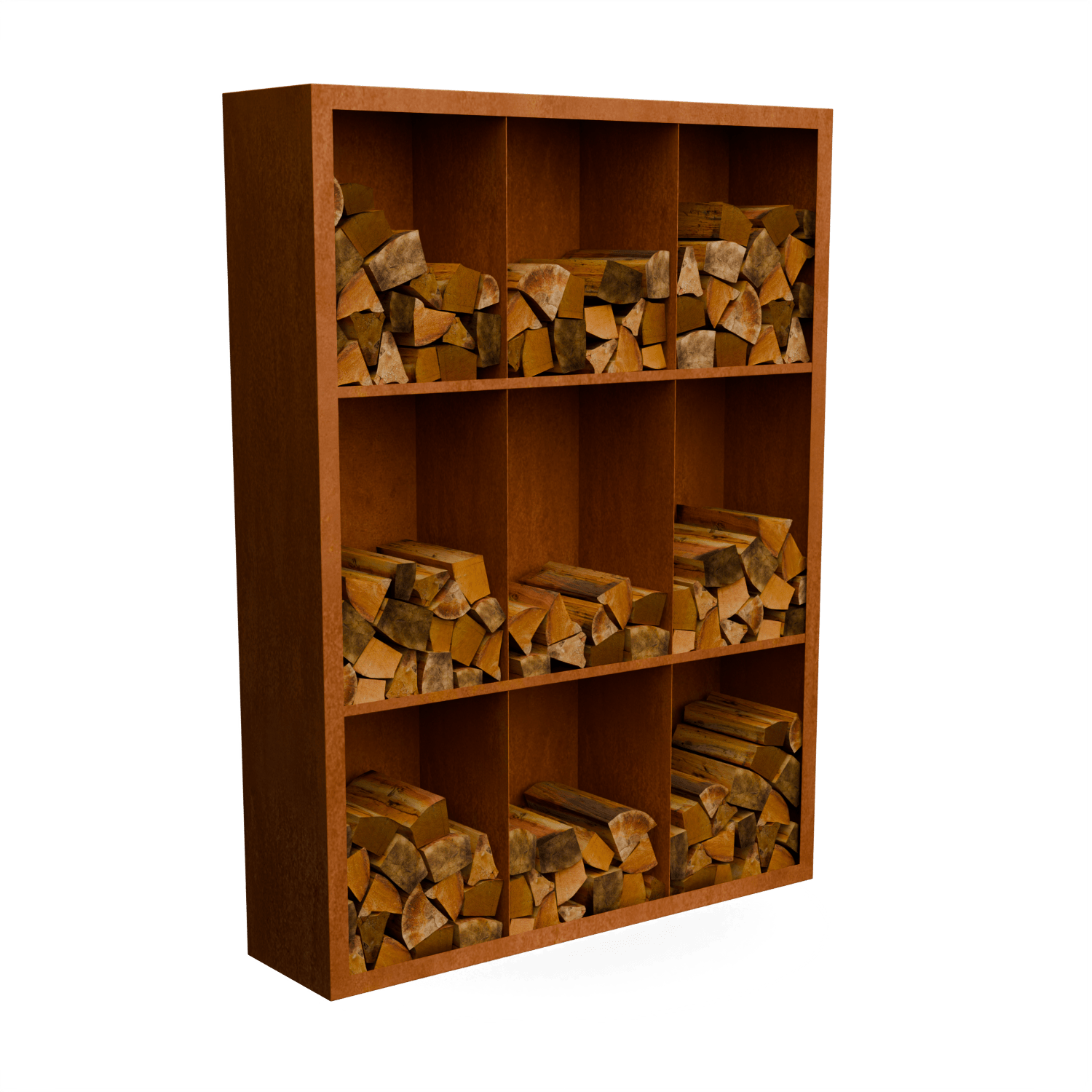 Holzlager Cortenstahl Egura – Unterteilung 9 Boxen mit rückwand – Länge: 1500 – Breite: 385 – Höhe: 2000