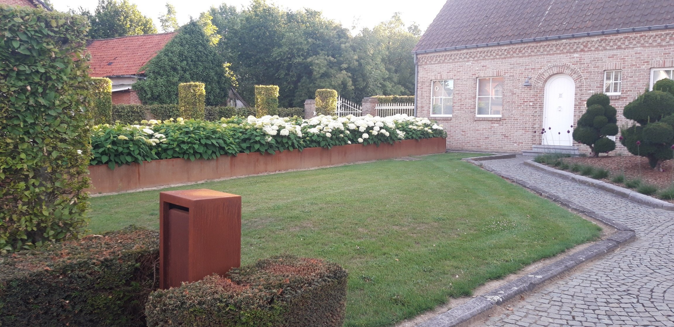 Stützwände aus Cortenstahl. Innenbogen 1000/1000x200x750mm (LxBxH). Material: 2 mm Cortenstahl.
