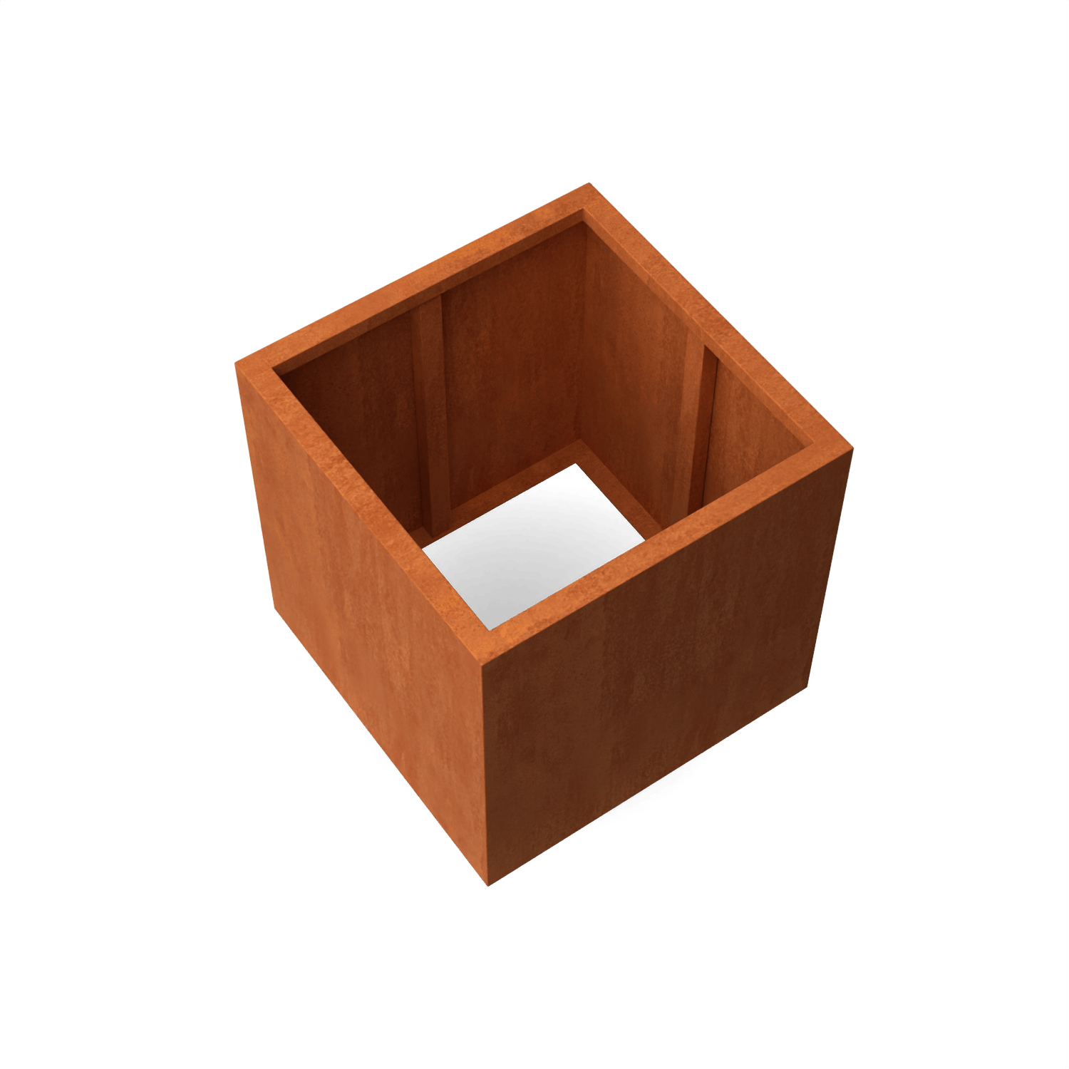 Quadra Cortenstahl Hochbeet 800x800x800mm (LxBxH) – Materialstärke 2mm. Ausgestattet mit Verstärkungsrohren auf der Innenseite. Ohne Sockel. Obere Kante um 50mm biegen.