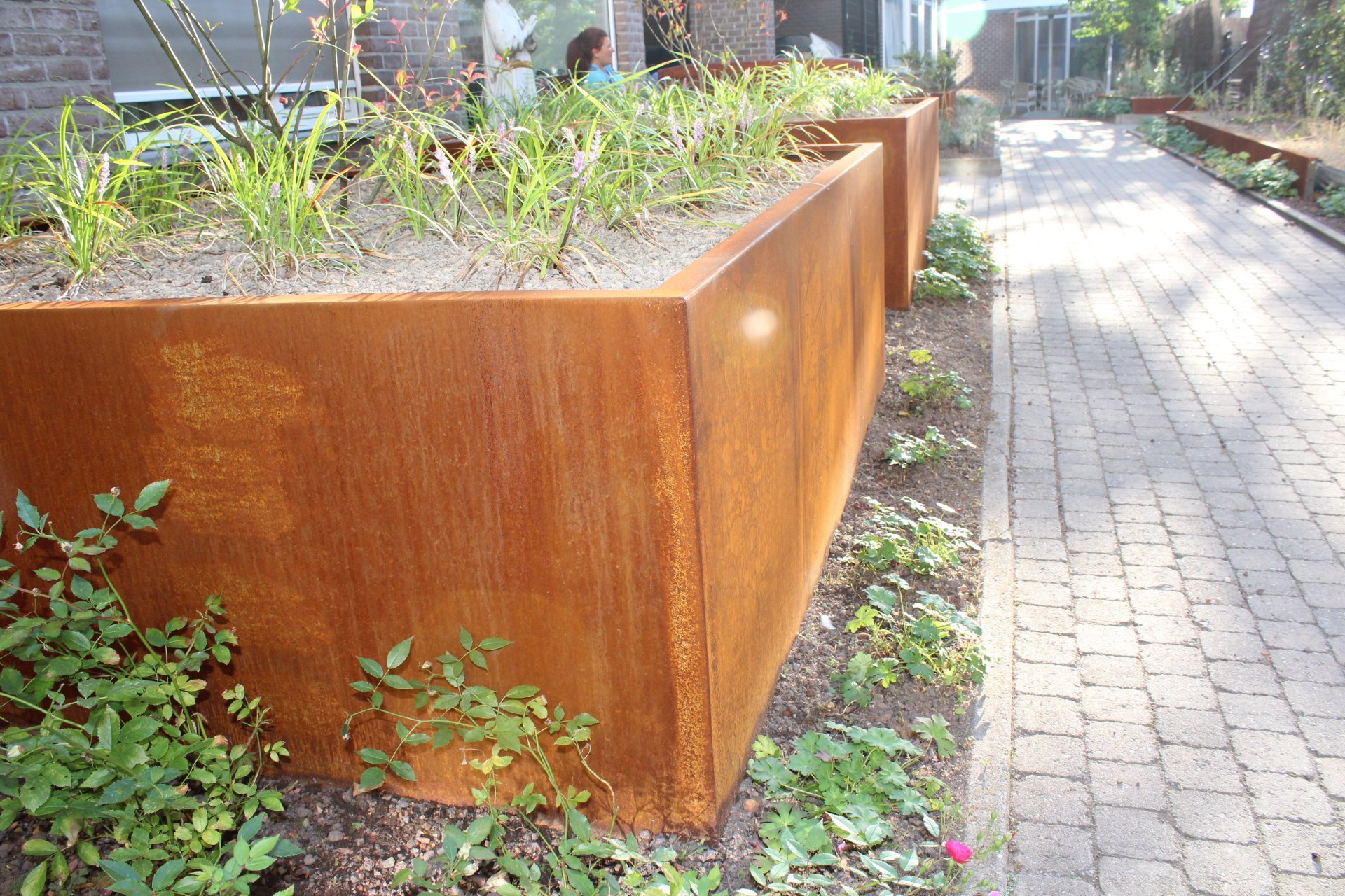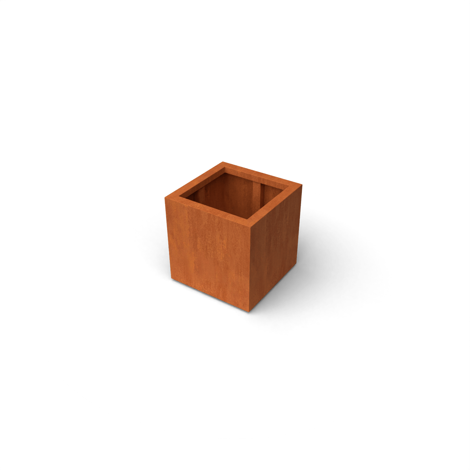 Pflanzgefäß Quadra Cortenstahl 500x500x500mm (LxBxH) – Materialstärke 2mm. Ausgestattet mit Verstärkungsrohren auf der Innenseite. Ausgestattet mit einem Boden mit Entwässerungslöchern. Schenkel 15 mm hoch. Obere Kante 50 mm gefalzt.